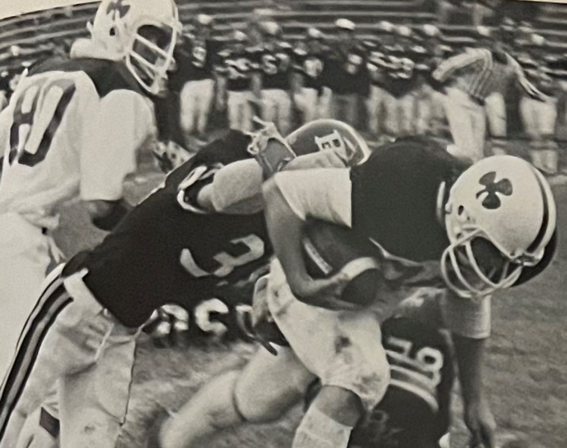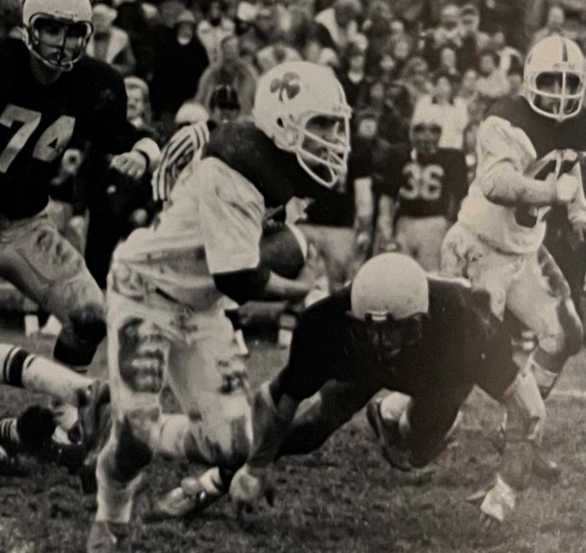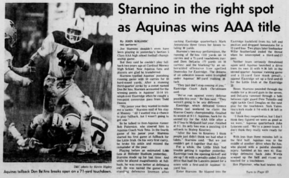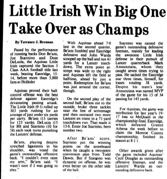 1979 found the Aquinas gridders in a familiar position, at the top of area football. Just like many past Aquinas teams, this years's squad consisted of many talented ballplayers and a lot of determination and dedication. It was these qualities plus the guidance of coaches Teta, Barton, Ferrara and Pilliter that led our team to a 9-1 overall record, the City-Catholic crown, and the Section Five championship. Many memories were stirred up as Aquinas punished its opponents on the playing field. The memories were of great Aquinas teams of the past and this year's team undoubtedly ranks among the best of them.