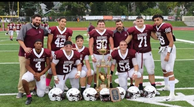 In 1964, Al '43 and Lucie Joseph donated this trophy to be given to the winner of the annual Aquinas-McQuaid football game. The trophy was to honor a priest who made a difference in Al's life while attending Aquinas Institiute. The trophy is a symbol of one's man belief in tradition and excellence and the true value of a Catholic education. A value that Al and Lucie took seriously as they sent all four boys to Aquinas and all four girls to Nazareth. The trophy has become a yearly tradition honoring two Catholic high schools and the values they embody. At the end of each game, coaches from each team pick an MVP. These players receive the Joseph Award in memory of Al and Lucie Joseph.