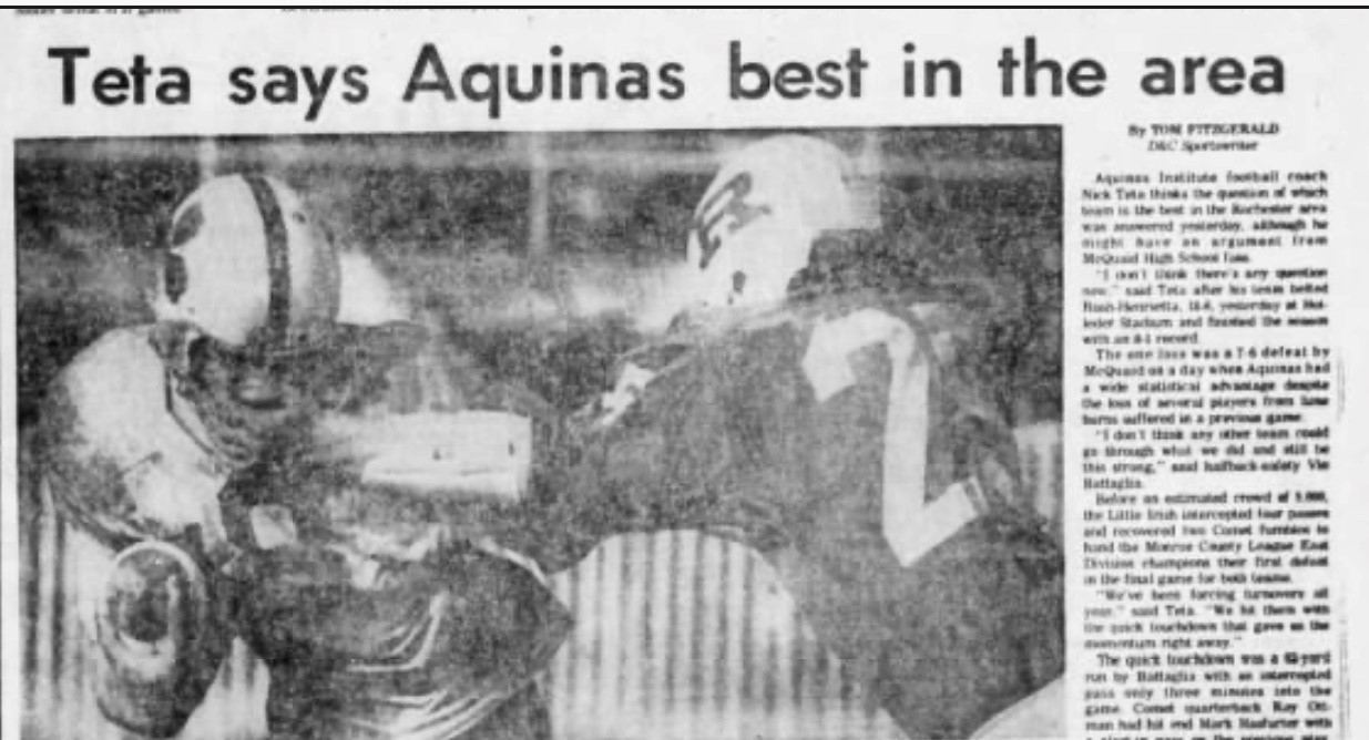 In 1970 Aquinas finsihed 7-1, with victories over Fairport and Newark but lost to Mt Pleasant of Schnectady. Rush Henrietta finsihed 8-0 and was voted number one, while Aquinas finished number two in the coaches poll. Again it would have been great to see these two teams collide to determine a true champion, instead of basing it on coaches votes.