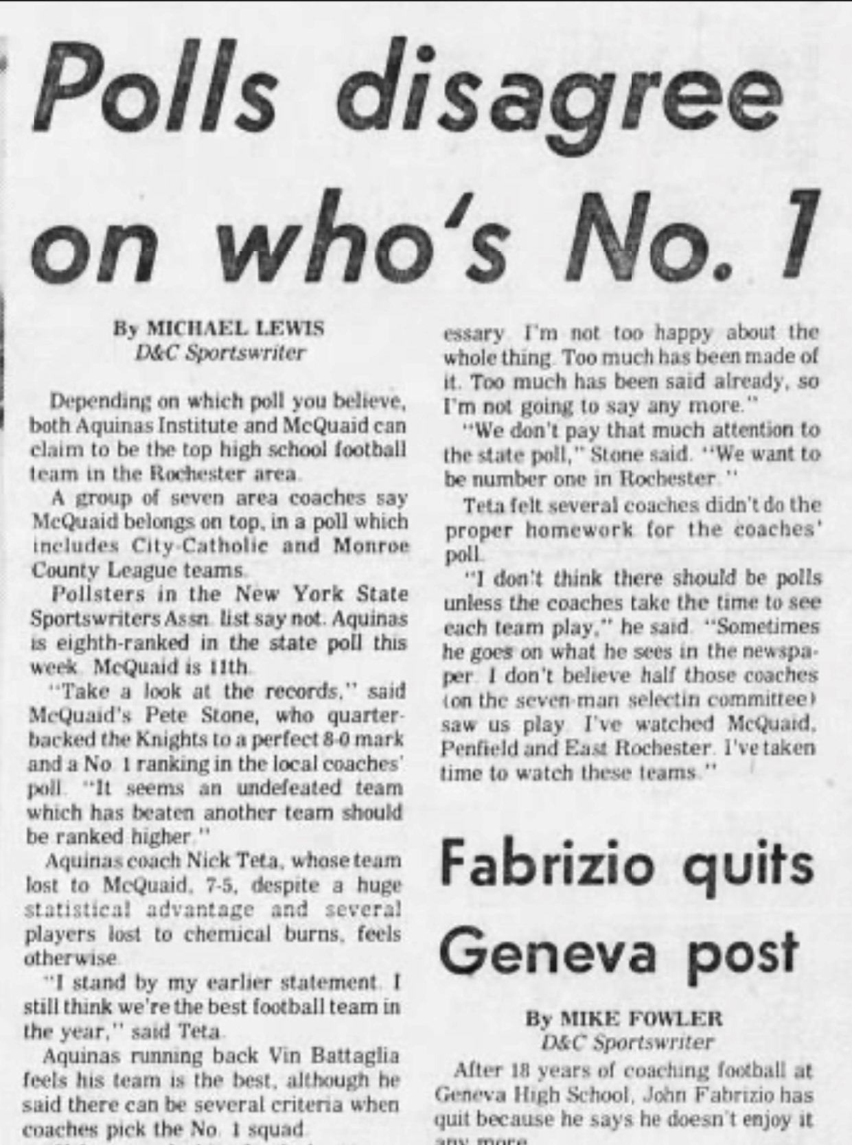 In 1975 Aquinas finished 8-1 and lost to McQuaid who finshed 8-0. Coaches felt McQuaid was better, since they beat Aquinas 7-6, and voted them number one in the coaches poll. However, the NYSSWA felt different and ranked Aquinas (8th) higher than McQuaid (11th) in the state rankings. This sparked much debate about who was the true champion. Aquinas felt it had a case since some starters were not able to play against McQuaid because of chemical burns suffered against Madison from the dehydrated lime on the field at Holleder Memorial Stadium.