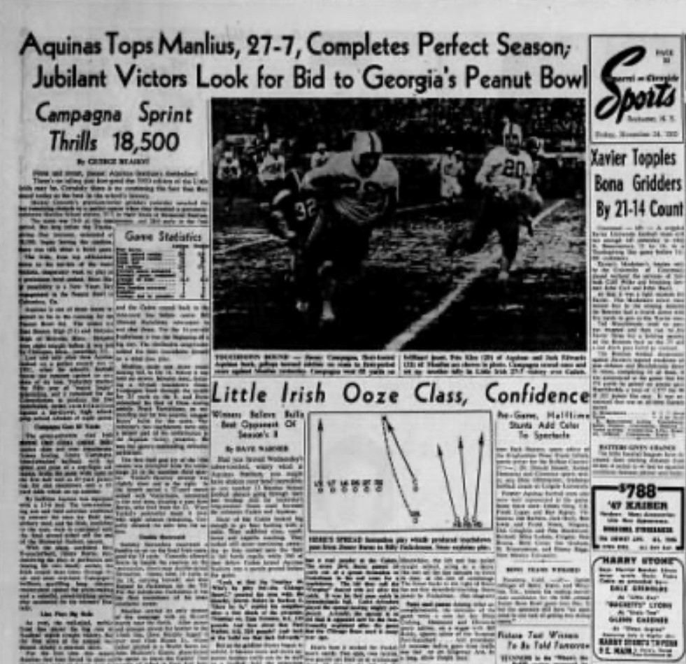 In 1969 Brighton was 8-0 playing only local competition while Aquinas finished 6-2 playing other Catholic schools and out of state opponents. The two would never play each other because the Catholic schools were not allowed to play the public schools yet. Brighton finished number one in the coaches poll and Aquinas was number two. The question is wouldn't it be great if these two could have played to see who was the real number one team.