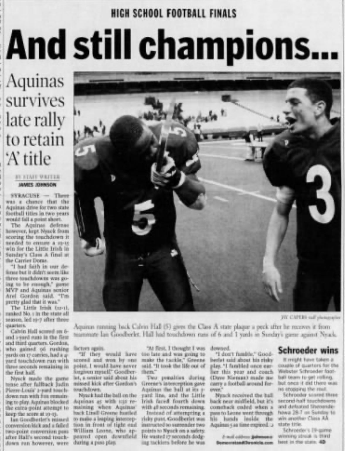 Three Section 5 Class A titles to go along with three NYSPHSAA Class A state championships in five years gave the Lil' Irish another great stretch of football success. Coach Anthony Lipani won Aquinas's first ever NYSPHSAA state championship since the state tournament began in 1993. Then Dave Nieman helped lead the Irish to back to back state titles in 2001 and 2002. Their combined record during this stretch was 43 wins to 5 losses. The Irish also had two athletes named AGR and NYSSWA Players of the Year.